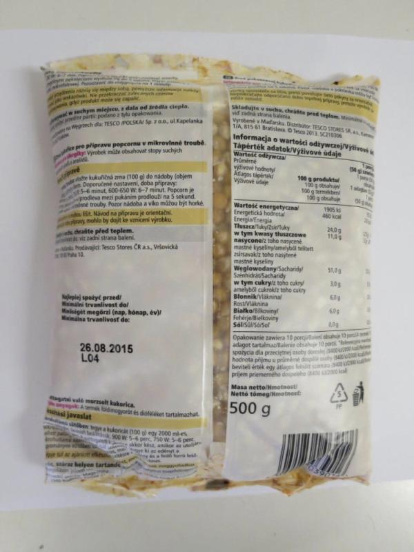 Státní zemědělská a potravinářská inspekce (SZPI) vložila do evropského systému rychlého varování (RASFF) informaci o zjištění nebezpečné potraviny TESCO Corn Beans, Zrna kukuřice pro přípravu popcornu v mikrovlnné troubě, hmotnost 500 g, výrobní šarže L04 s datem minimální trvanlivosti do 26. 8. 2015. Laboratorní analýza SZPI u této šarže prokázala přítomnost mykotoxinu fumonisin B1 a B2 v množství 4395 mikrogramů na kilogram (μg/kg), přičemž maximální přípustné množství je příslušným předpisem stanoveno na 1000 μg/kg. Nabízením potraviny se čtyřnásobně vyšší koncentrací fumonisinu oproti limitu porušil prodejce nařízení Komise (ES) 1881/2006 a SZPI proto nařídila neprodleně stáhnout předmětnou šarži potraviny ze všech prodejen společnosti TESCO Stores ČR, a.s. a s prodejcem zahájí správní řízení o uložení pokuty. Při došetřování vyplynulo, že prodejce dovezl do ČR od svého dodavatele GILAN TRADING KFT., HU 2071. Páty KEREKDOMBI U.7., Maďarsko, celkem 3 840 ks nevyhovujících balení potraviny. Inspekce doporučuje všem spotřebitelům, kteří mají uvedenou šarži výrobku doma, aby jej nekonzumovali.